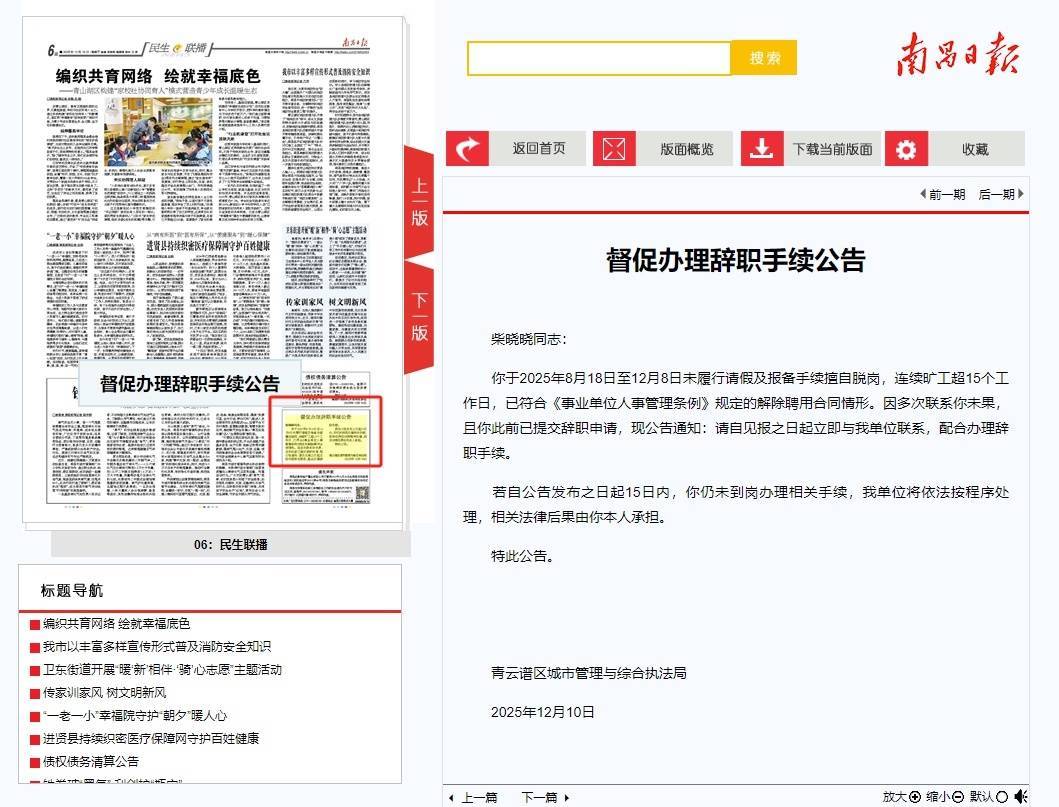 公告称,柴晓晓同志于2025年8月18日至12月8日未履行请假及报备手续擅自脱岗,连续旷工超15个工作日,已符合《事业单位人事管理条例》规定的解除聘用合同情形。“因多次联系你未果,且你此前已提交辞职申请,现公告通知:请自见报之日起立即与我单位联系,配合办理辞职手续。若自公告发布之日起15日内,你仍未到岗办理相关手续,我单位将依法按程序处理,相关法律后果由你本人承担。”